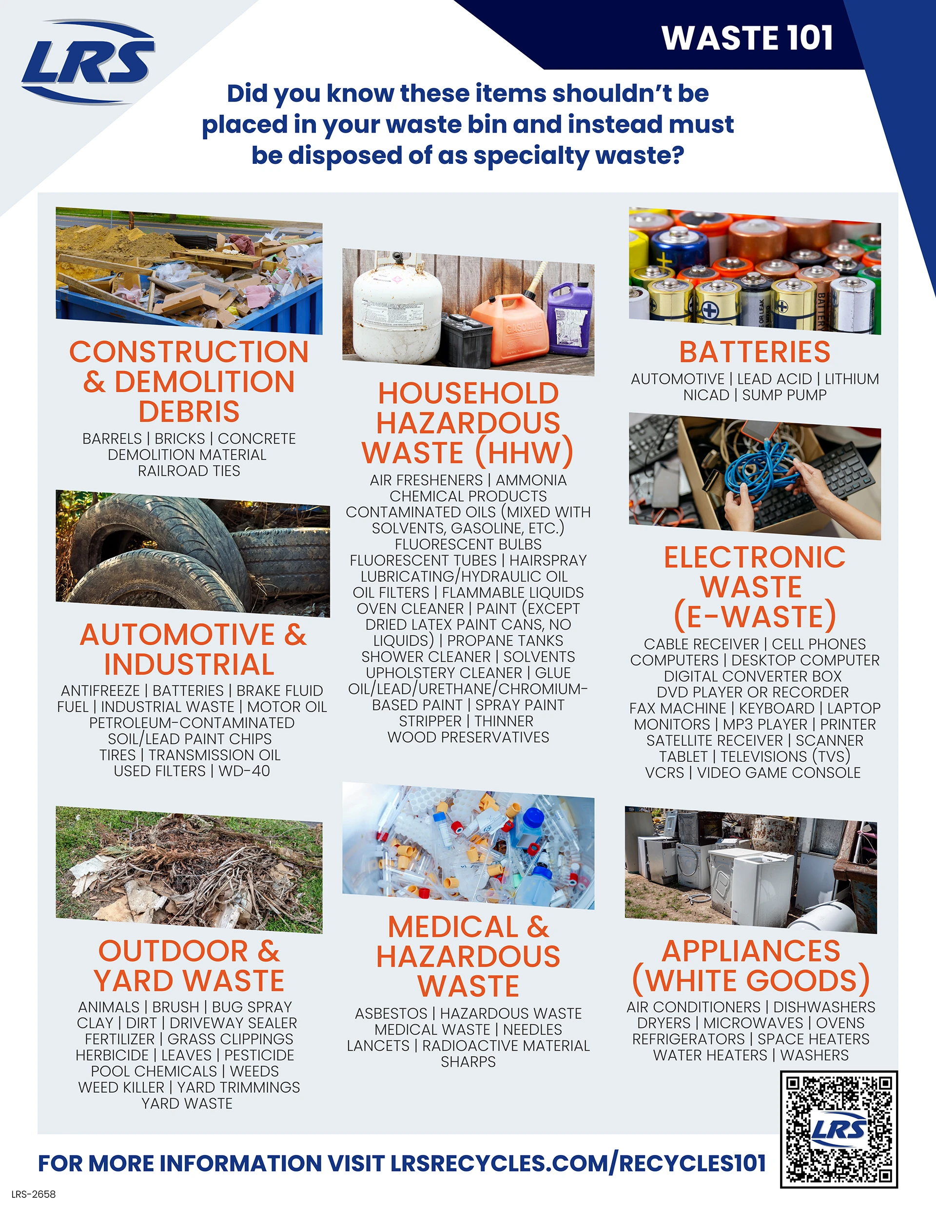 Household hazardous waste (HHW) can be dangerous to health and the environment. It’s often flammable, reactive, corrosive, or toxic. LRS does not have a drop-off facility for HHW, however some municipalities have the option to service HHW. Please see your municipalities website for details. For questions on e-waste service, please call us at 844.NEED.LRS or Contact Us.