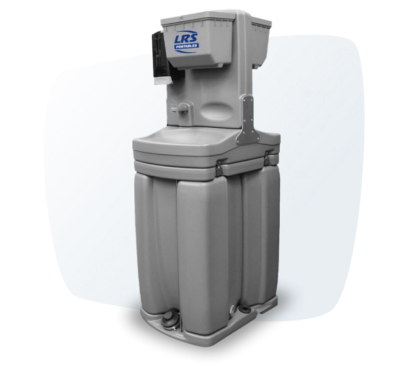 Two-sided hand washing stations can be paired with any portable restroom unit to help promote cleanliness and reduce the spread of germs. These stations have two soap dispensers, liquid hand soap, four paper towel dispensers and a foot pump to control the water.